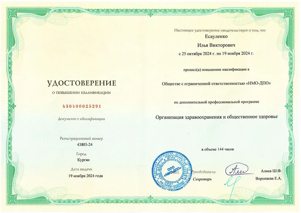 Удостоверение о повышение квалификации по программе "Организация здравоохранения и общественное здоровье" 2024 год